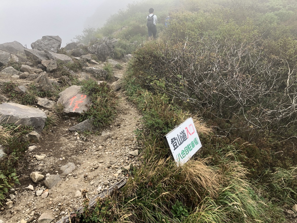 登っていくとますますガスは濃くなりさらに風が出てきた。ウインドブレーカーを着る。