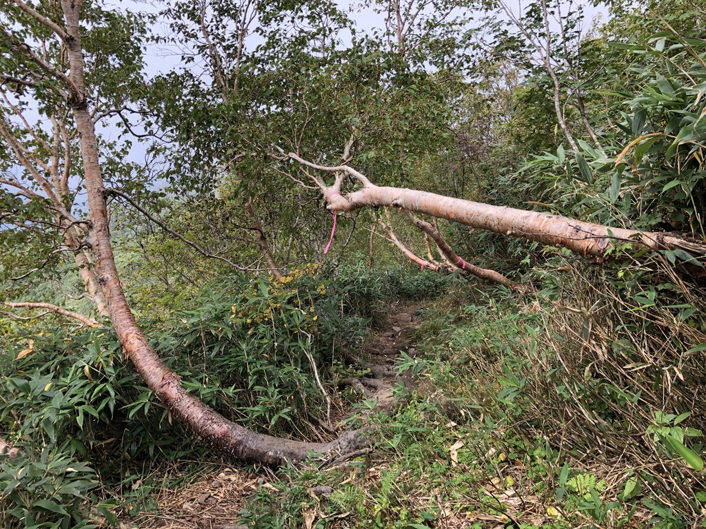 八合目に下る道は明るい樹林帯の中をいく。ダケカンバの林である。やはり土があると歩きやすい。以前下った谷川岳の道を思い出した。