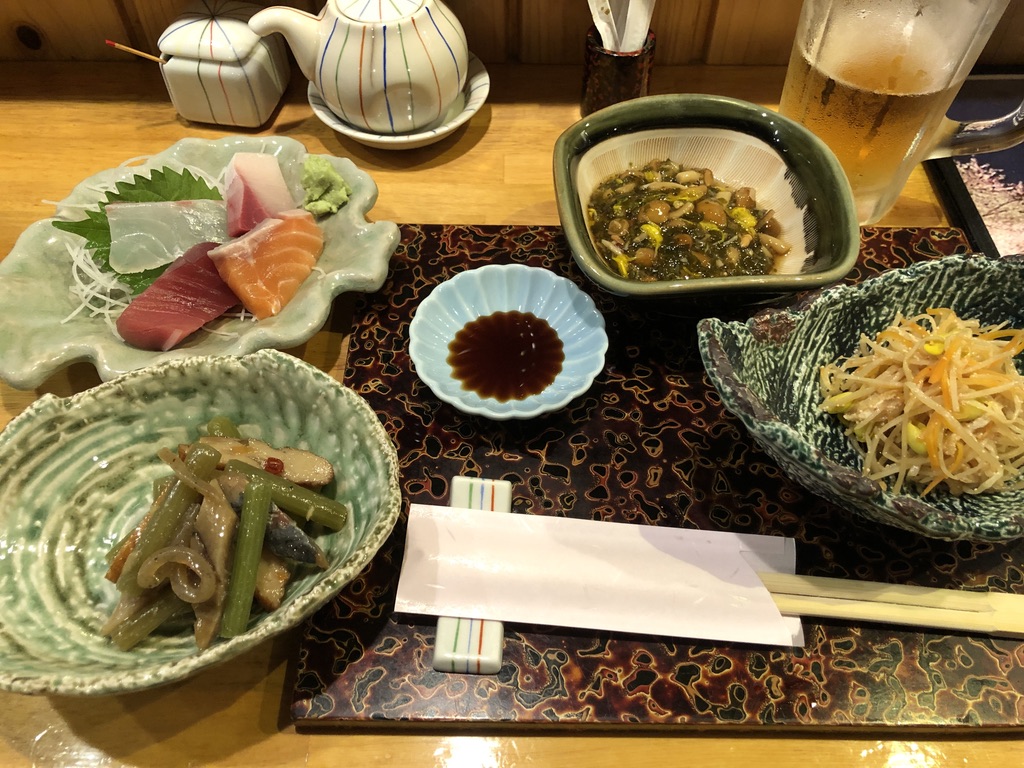 19時にバスターミナル前で下車。ネットで調べた近くの居酒屋に夕食に行く。